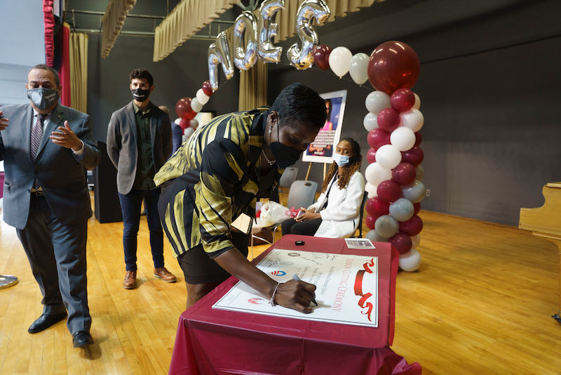 Joining Superintendent León and Principal Gilliam today were Board Vice-President Johnson, Board Member Gonzalez, Mayor Baraka, Senator Ruiz, Councilwoman McIver, Nurse Emenaka, Mr. Ginsberg of AeroFarms, Deputy Johnson, Chief of Staff Nazario, and Assistant Superintendent Dr. Harrington.