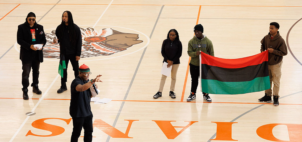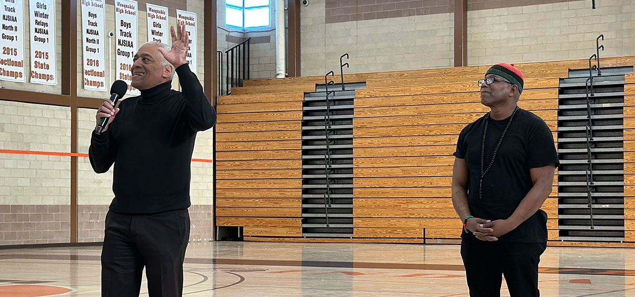 History and Africana Studies Teacher Bashir Muhammad Ptah Akinyele leads the Black History Month opening ceremony at Weequahic High School.