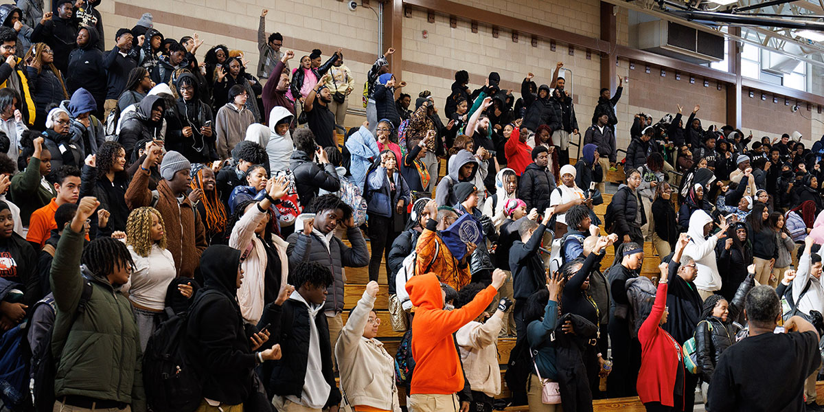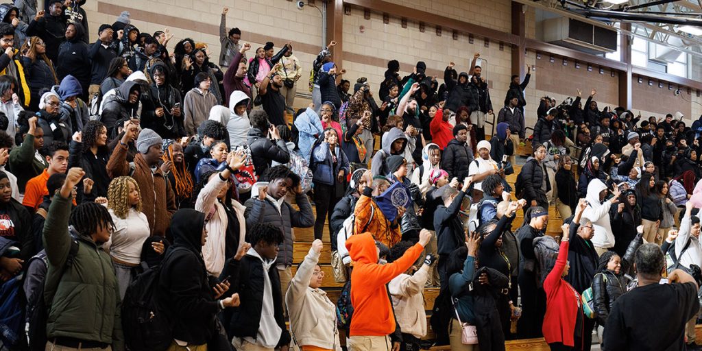 Weequahic High School students and staff participating in the school’s Black History Month opening ceremony.